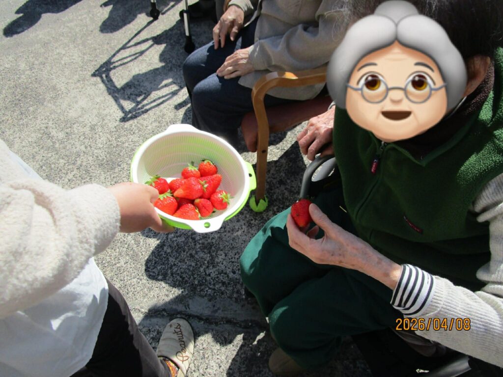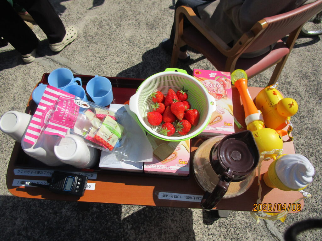 今月はお天気の良い日に、皆さまで外に出て日向ぼっこをしながら、おやつの時間を楽しみました。