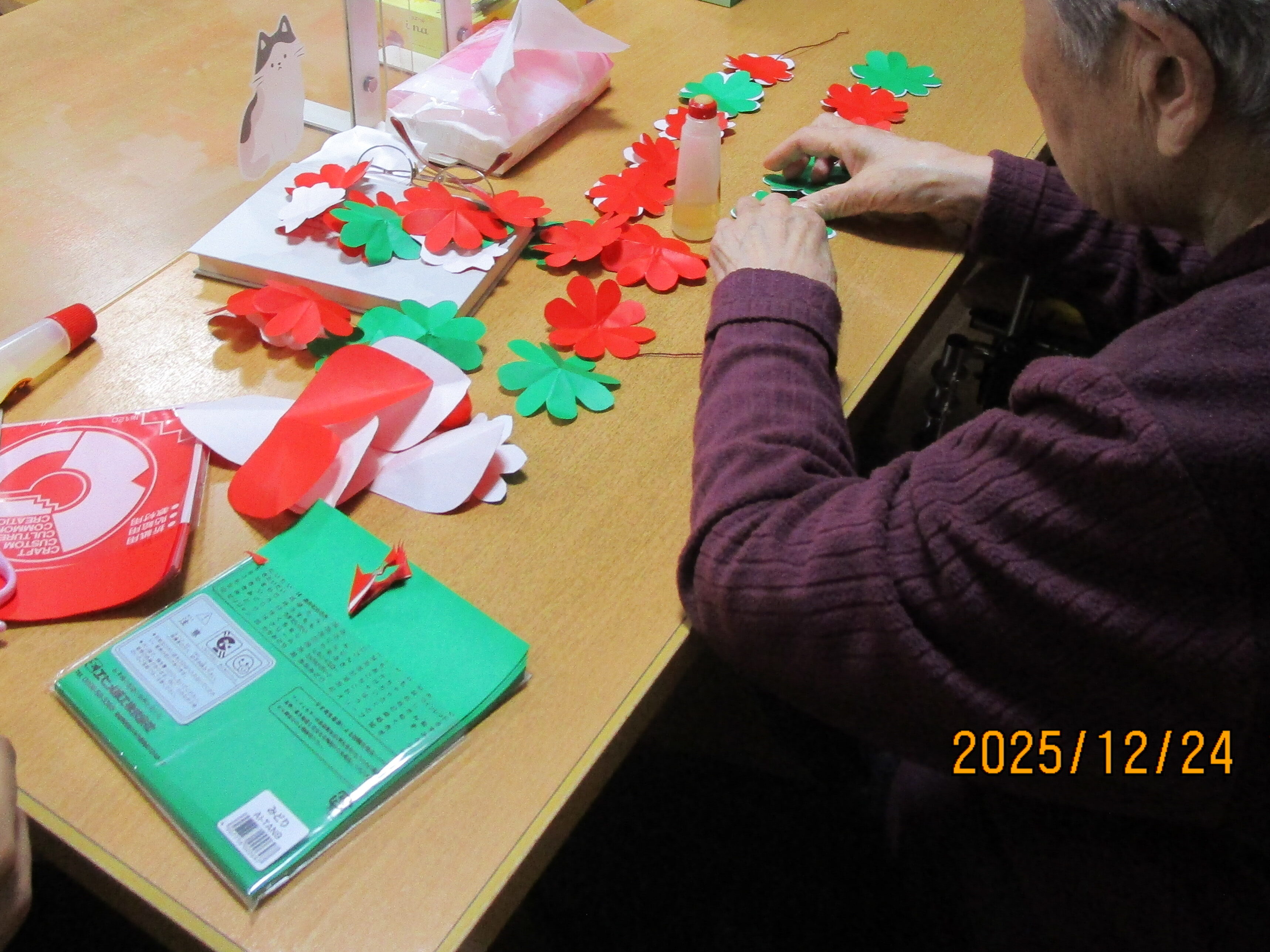 こちらは、最近の製作活動の様子です。若手の職員と一緒に、色紙で花飾りを作っていただきました♪