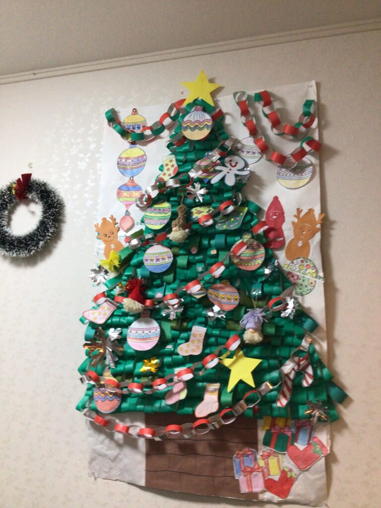 利用者さんとともに作成したクリスマスツリーの壁紙を玄関に飾ったり
