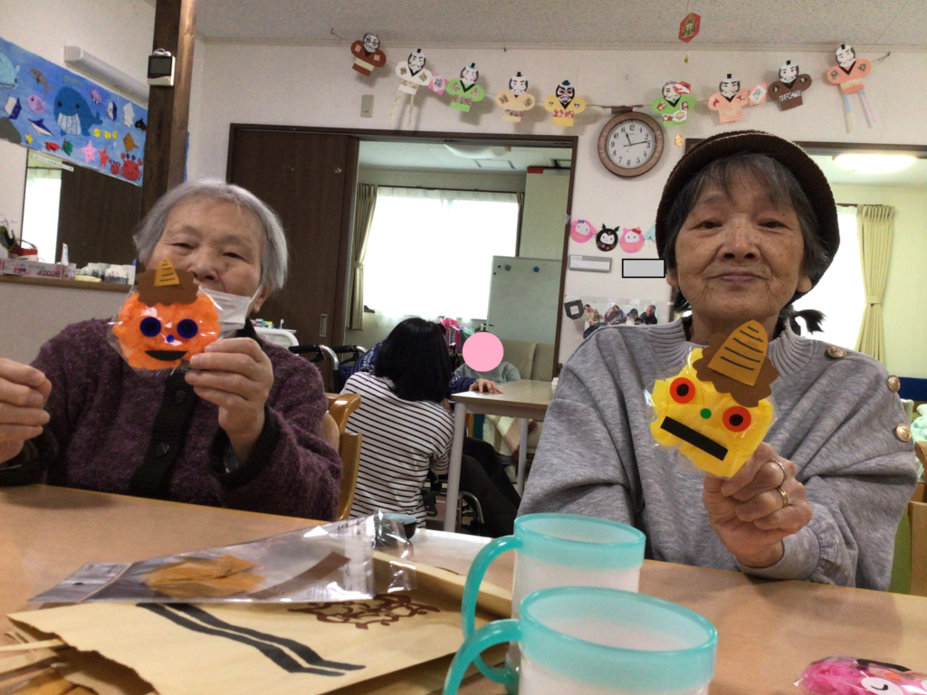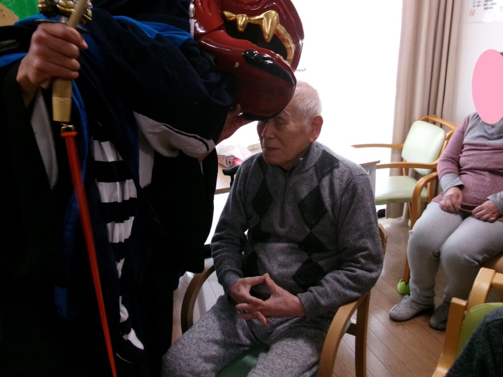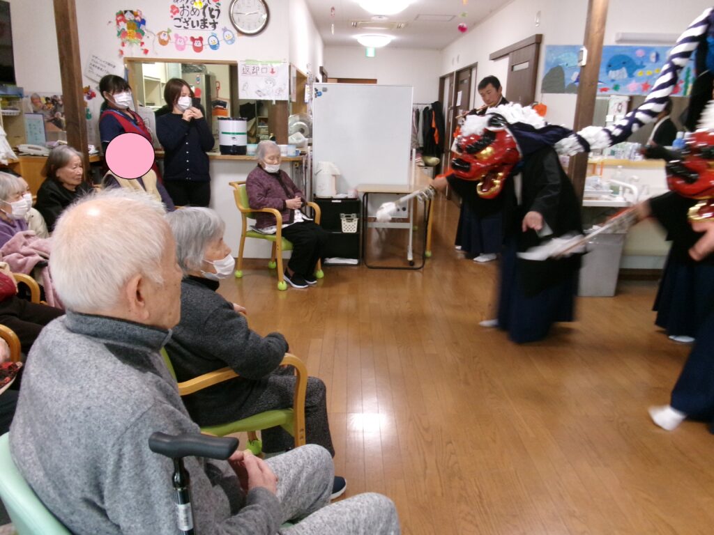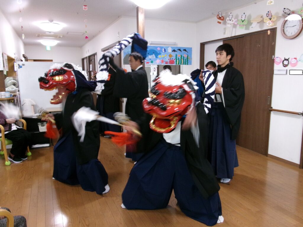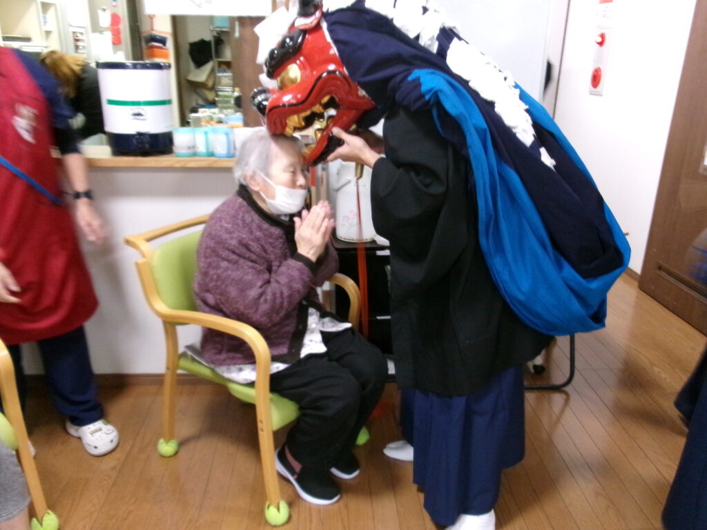勇壮な舞い踊りの後、利用者様の頭を噛んでもらって邪気を払い無病息災をお願いしました。
