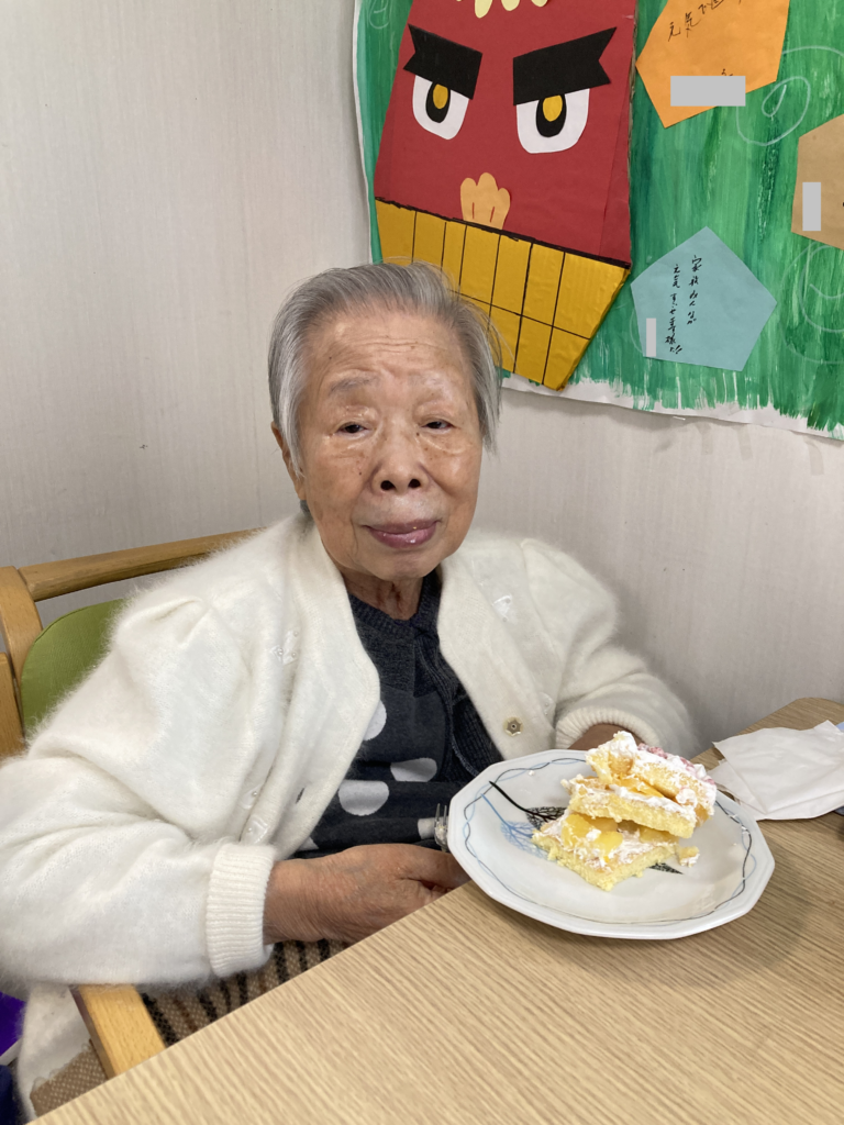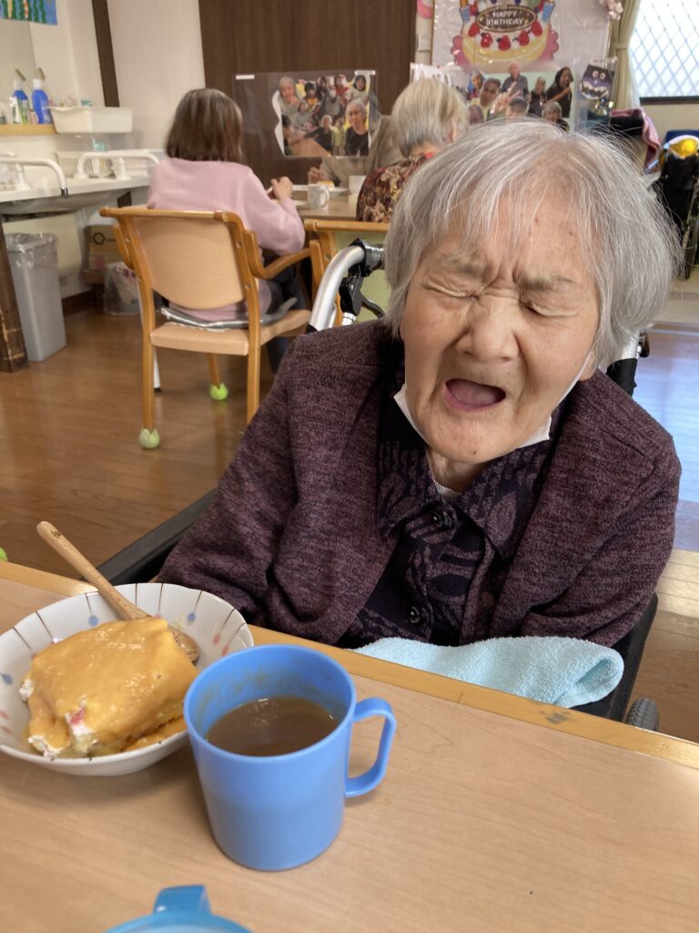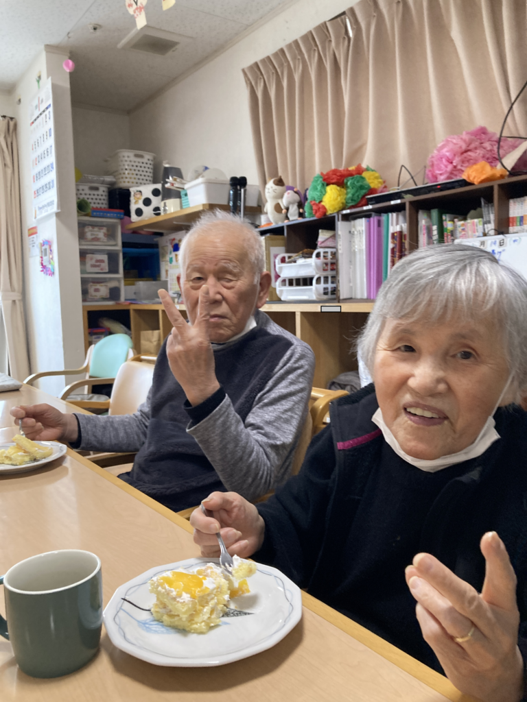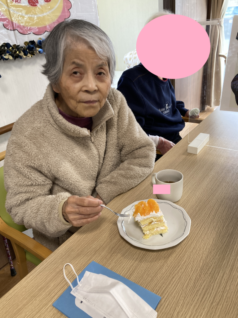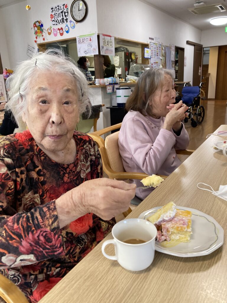 お祝いしてくれた他の利用者様と一緒にケーキをたべ、美味しそうにされていました。
