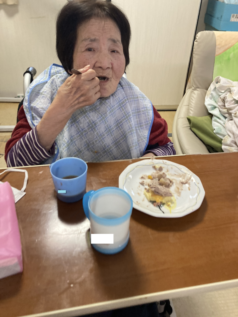 利用者様の自尊心を尊重して、生活の質(QOL)の向上を目指し「利用者様ができることを増やす」事に重点を置く為、施設で過ごす際、例えば自身のお茶をコップにくみに行ったり、お食事の前にテーブルを拭いたり、食べ終わったお膳を返却したりを、お一人お一人その方の身体状態の評価に基づいて、個別にアプローチを行っています。